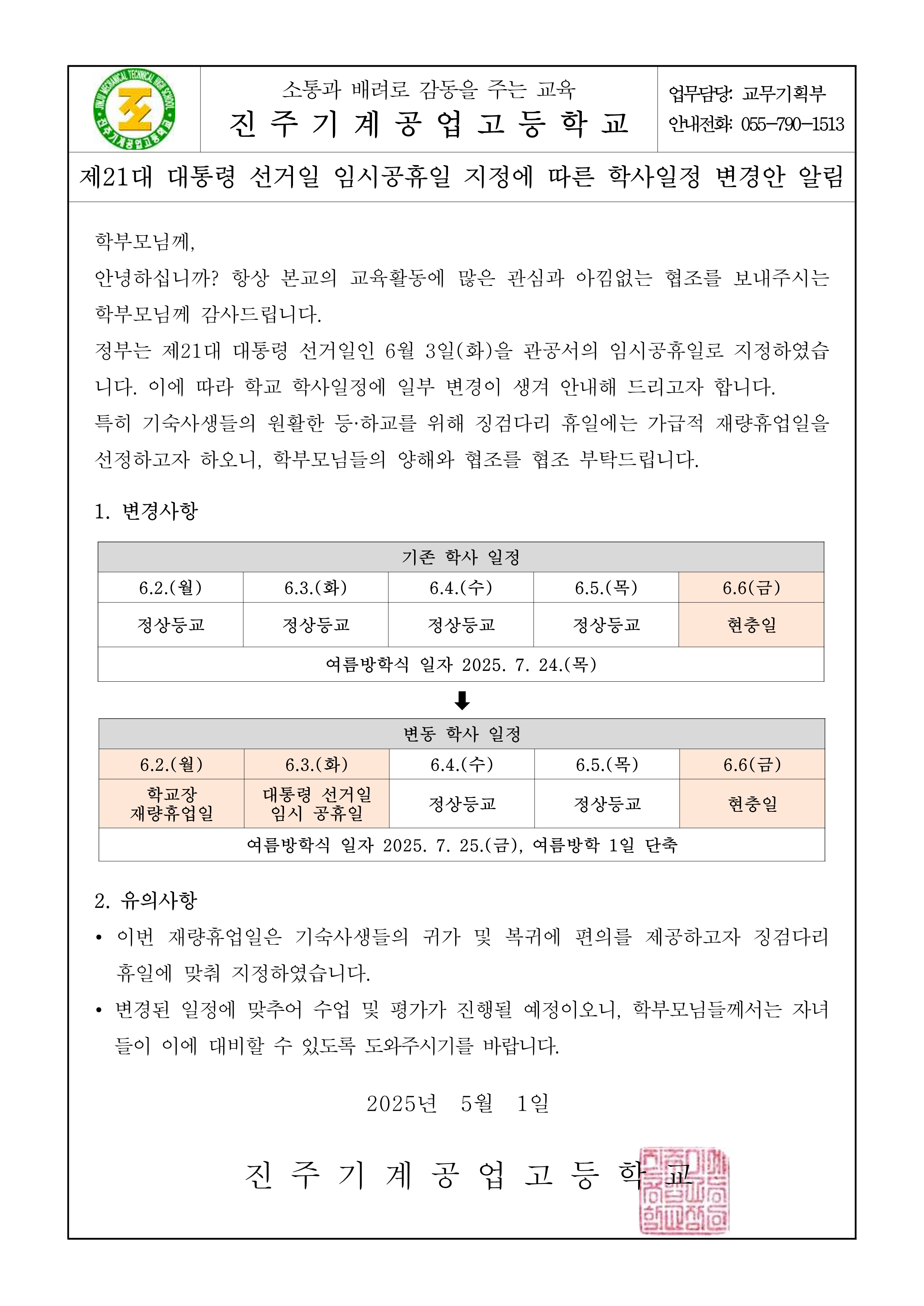 제21대 대통령 선거일 임시공휴일 지정에 따른 학사일정 변경안 알림
